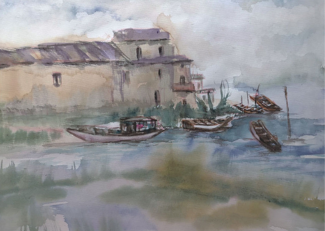 水彩画是用水调和透明顔料作画的一种绘画方法,由于色彩透明,一层顔料覆盖另一层产生出的特殊效果。观余凡的作品,把握了水彩画的精髓。他今年选作月历的画作,多选于南方的大自然,山水村舍、田园风光。南方的风光空灵秀气,气象氤氲万千,恰好与他的画风相合,利于他的表达。