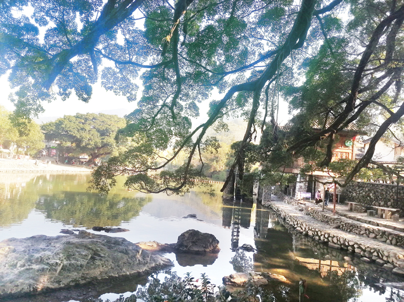那时在孩子们心灵中,这就是世界上最大的树,遮天蔽日、铺天盖地,它用青铜般粗壮的树干伸向河面,撑起一片蓝天。有些空心的树干正是孩子游戏的场所。树干上藤蔓缠绕,还有许多不知名的植物寄生在枝干上,最让人难忘的是一种叫薜荔的藤蔓植物,粗大的藤条包裹着树干,结着许多形似秤铊的绿色果实。一些胆大的孩子顺着伸向河面的树干攀爬,采其果实。那可是现在难得的天然果冻,取果中之子,曝晒后用纱布挤出果胶,制成柔滑晶弹,凝润爽滑的果冻,是孩子们夏季最美的享受。
